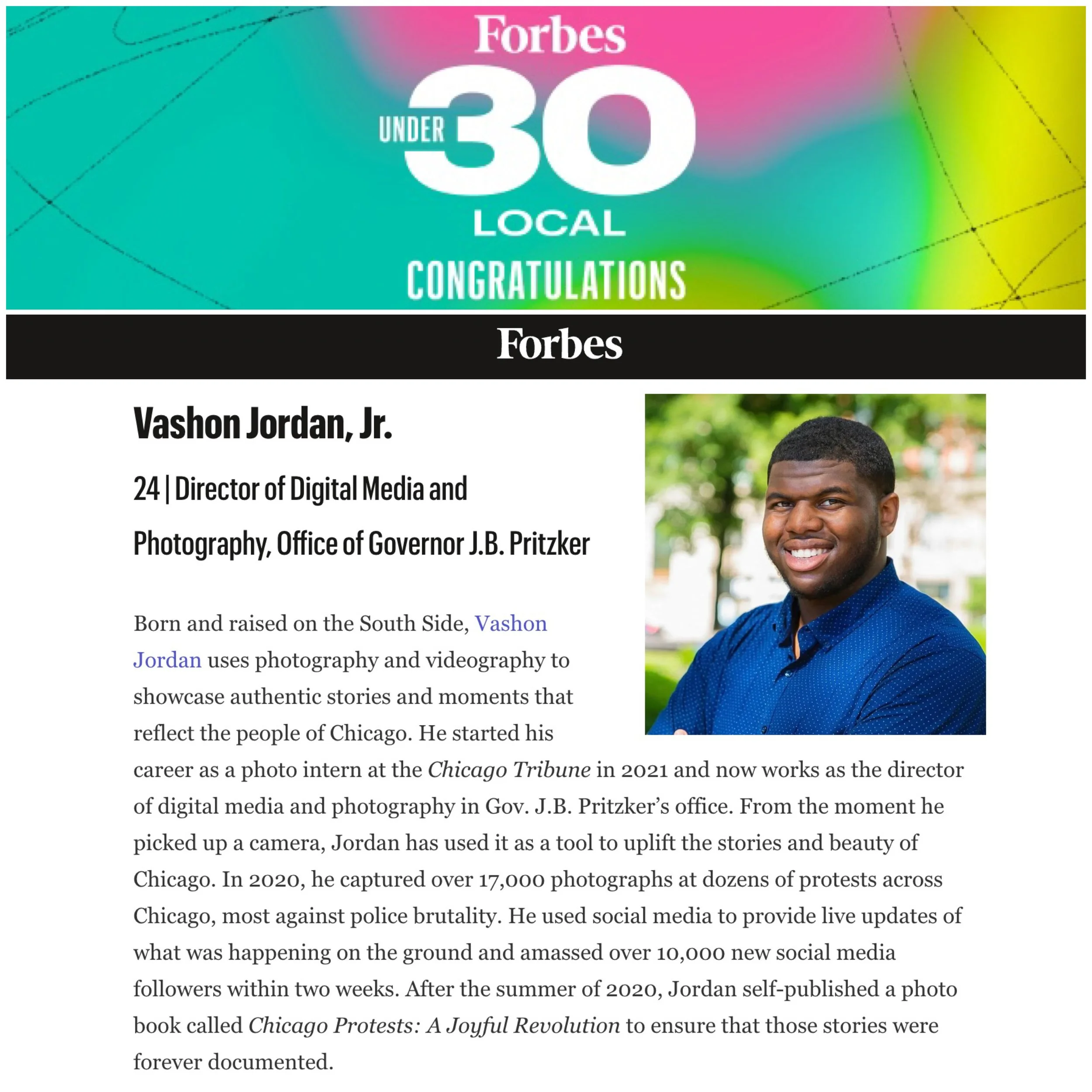 He was a photography intern for the Chicago Public Schools from 2018-2021, with a summer internship with the Chicago Mayor’s Office in 2018. Jordan joined the Chicago Tribune as a staff photographer intern for the summer of 2021 then worked as the Staff Photographer at JB for Governor later as the Director of Digital Media and Photography at the Office of Governor JB Pritzker. Vashon currently works as Photographer & Creative Director at the Office of Mayor Brandon Johnson.